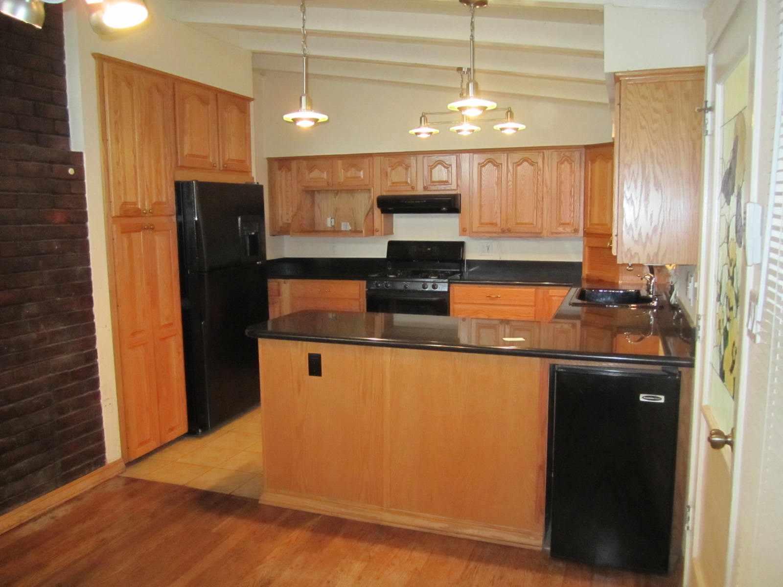 honey oak kitchen cabinets with black countertops ...